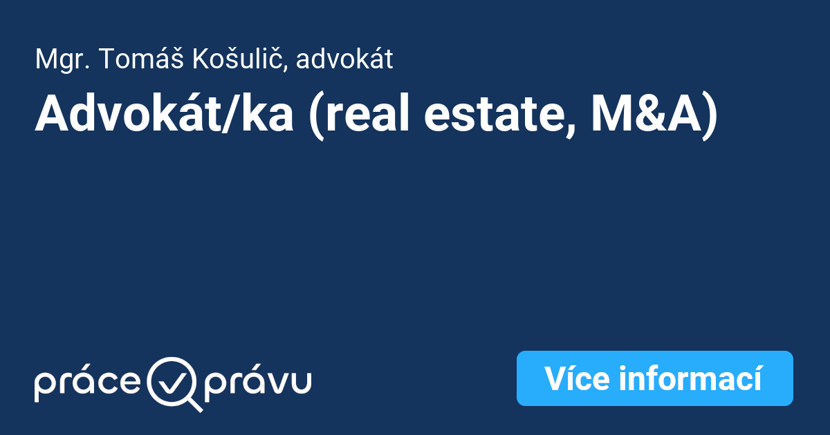 Kategorie inzerátu: advokátPrahamalá společnost (1-10 lidí)obchodní právoobčanské právoprávo nemovitostípracovní právoM&Adue diligencerodinné právoanglický jazyk